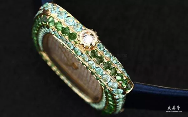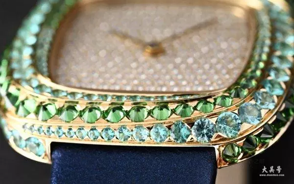 与正面相比,这款腕表的背面就非常简单了。它采用密封表背设计,底盖采用18k黄金材质打造,上面没有做额外的装饰,只镌刻了包括限量编号及狗头标记等信息。但表圈上的帕拉伊巴碧玺也从螺旋设计延伸到了表背上,为简单的表背增加了不少亮点。至于机芯,品牌为这款腕表配备了一款石英机芯,省心方便是它的最大优势,毕竟作为贵妇怎么可以担心动力问题,并且亲手调节时间呢?