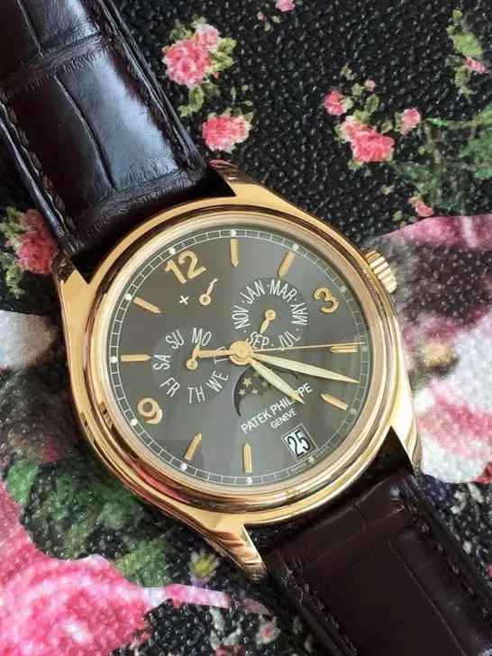 今天为大家介绍一款‘5’开头的新款男表中比较有名的一款,百达翡丽复杂功能计时5146系列:5146J-001,这款男士自动机械表的机芯直径是39毫米,也就是3.9厘米,背透蓝宝石玻璃。深棕色鳄鱼皮表带,表壳为18K金。腕表之家销售价格为2017年1月的最新报价为296200,回收价格在16-17w。当然做过二手奢侈品交易的都知道,自动机械手表的新旧、磨损、时差、附件、小票都是价格的影响因素。