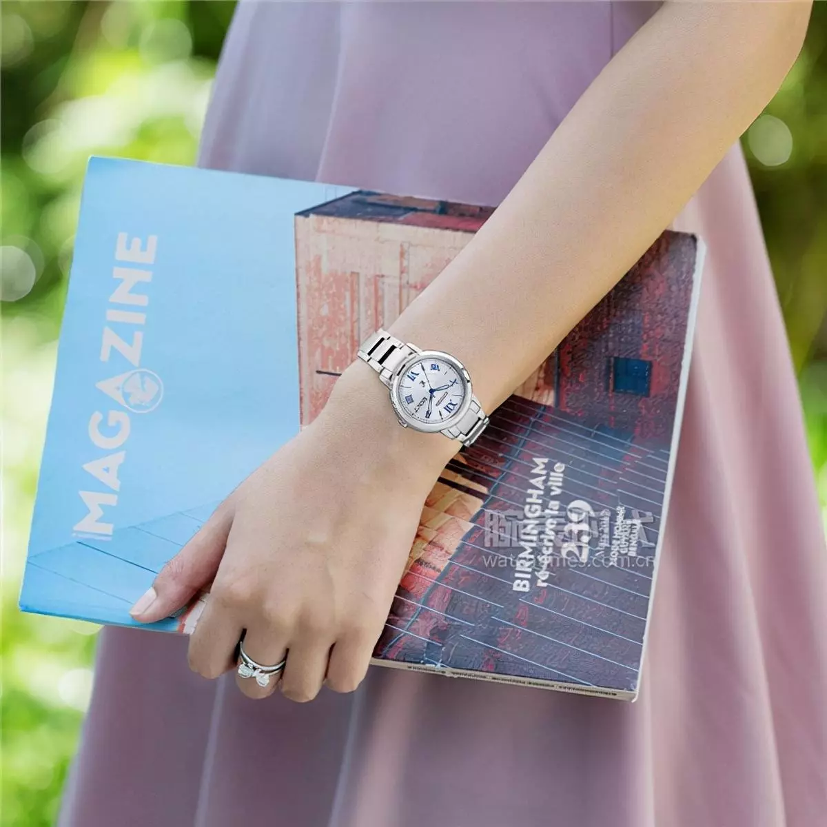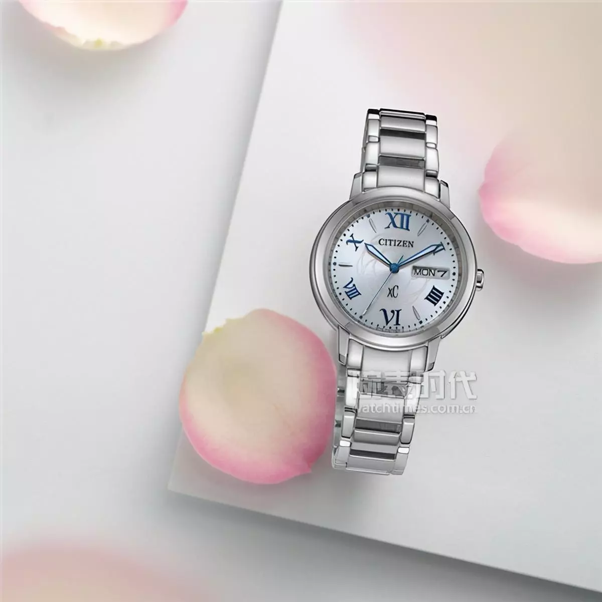 这款西铁城EW2420-51AB 光动能罗马数字简约时尚女士腕表同样带着一股纯净仙气,以最纯粹的设计来展现最自然本真的美学。腕表采用32毫米不锈钢表壳搭配银色表盘,表盘中心一朵玫瑰暗纹若隐若现。曲线优美的蓝色罗马数字时标搭配蓝色剑形指针,刚柔并济。腕表配备蓝宝石玻璃表镜,搭载光动能机芯,防水50米,搭配不锈钢表链。EW2420-51AB 官方价格3,480元人民币。