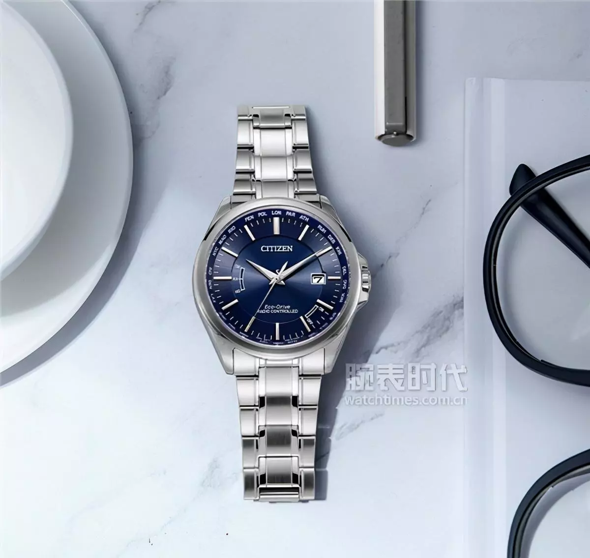 西铁城也有更加简约的腕表款式,例如这款西铁城CB0250-84L 光动能多局电波万年历男士钢带腕表,功能精简了不少,设计也更加简约,让人一目了然。腕表采用43毫米不锈钢表壳搭配饰有放射状太阳纹的蓝色表盘,表盘最外缘为26个世界城市环,3点钟位置设有日历窗,9点钟位置设有信号接收显示,其中RX代表准备授信,OK代表信号接收成功,NO代表没有接收到电波信号。银色太妃指针和条形时标呼应不锈钢表壳,腕表布局遵循对称原则,和谐美观。腕表搭载西铁城H145光动能机芯,环保便捷,可多局接收电波信号自动对时,精准可靠。100米的防水也让人很有安全感。官方价格3980元人民币。