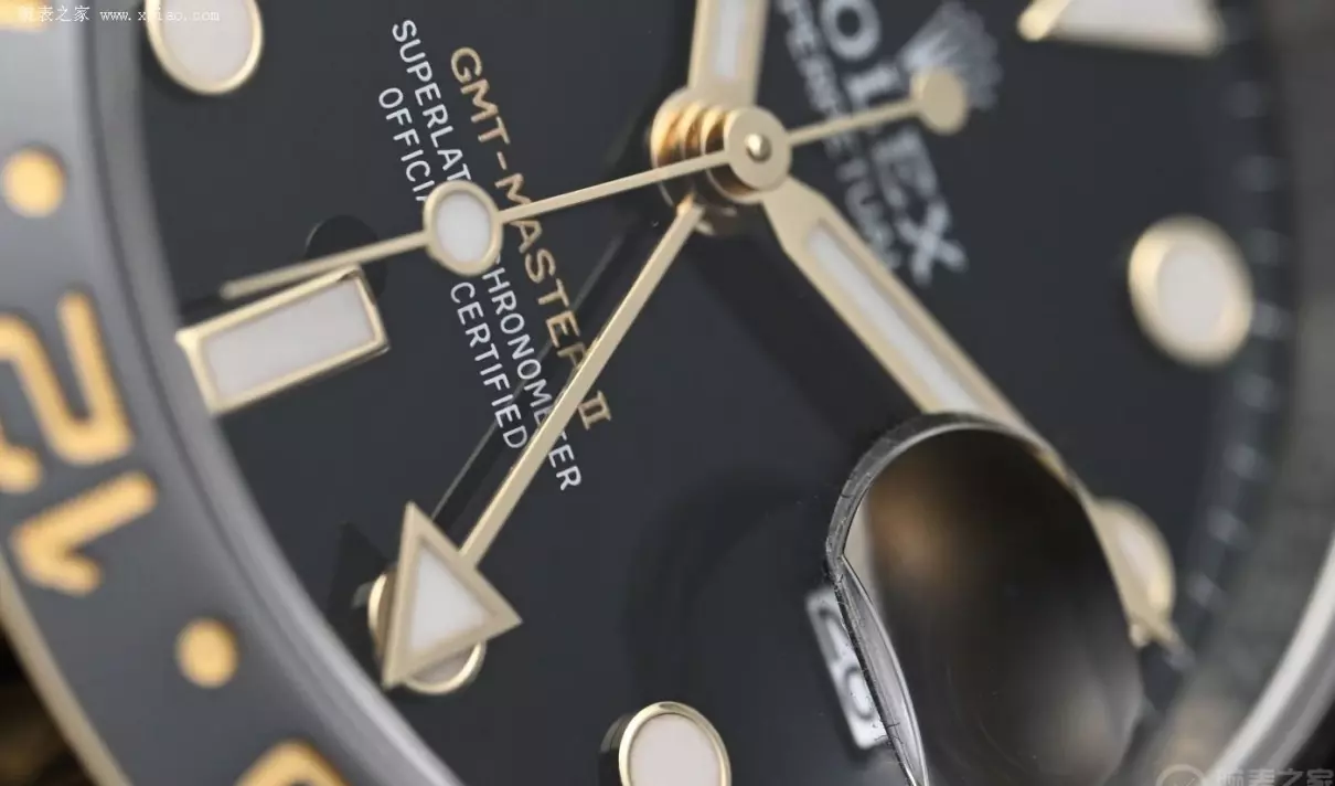 早期的Cerachrom 陶质字圈仅为单一颜色。或许是为了提升格林尼治型II的辨识度,扩大与潜航者型、海使型等单色字圈表款的差异。劳力士在2013年研制出了双色陶质字圈,率先应用于同年发售的“蓝黑圈”Ref.116710BLNR上。此后双色陶瓷字圈逐渐成为格林尼治型II标配,正如新款黄金钢腕表采用的深灰色加黑色组合。下面不妨来看看,这枚新品还有哪些提升。