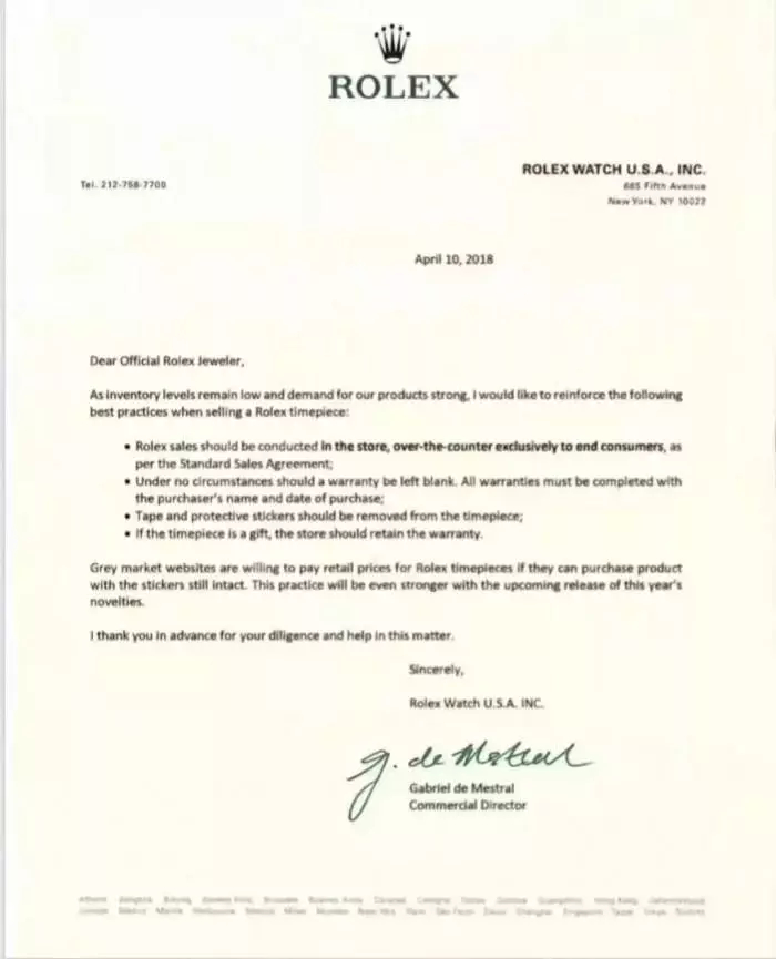 劳力士官方近日推送给授权经销商一份备忘录显示。自2018年11月2日起,为了强化合规销售和避免不当销售,劳力士将施行一下四项全新政策: