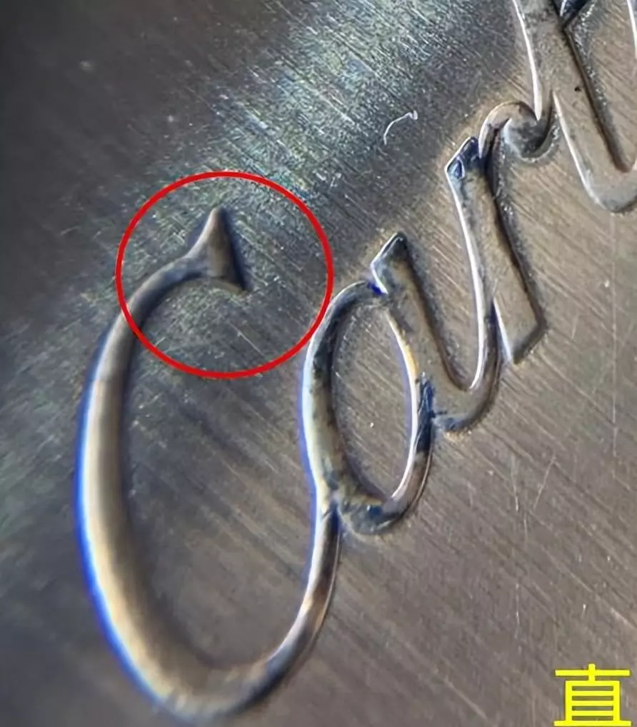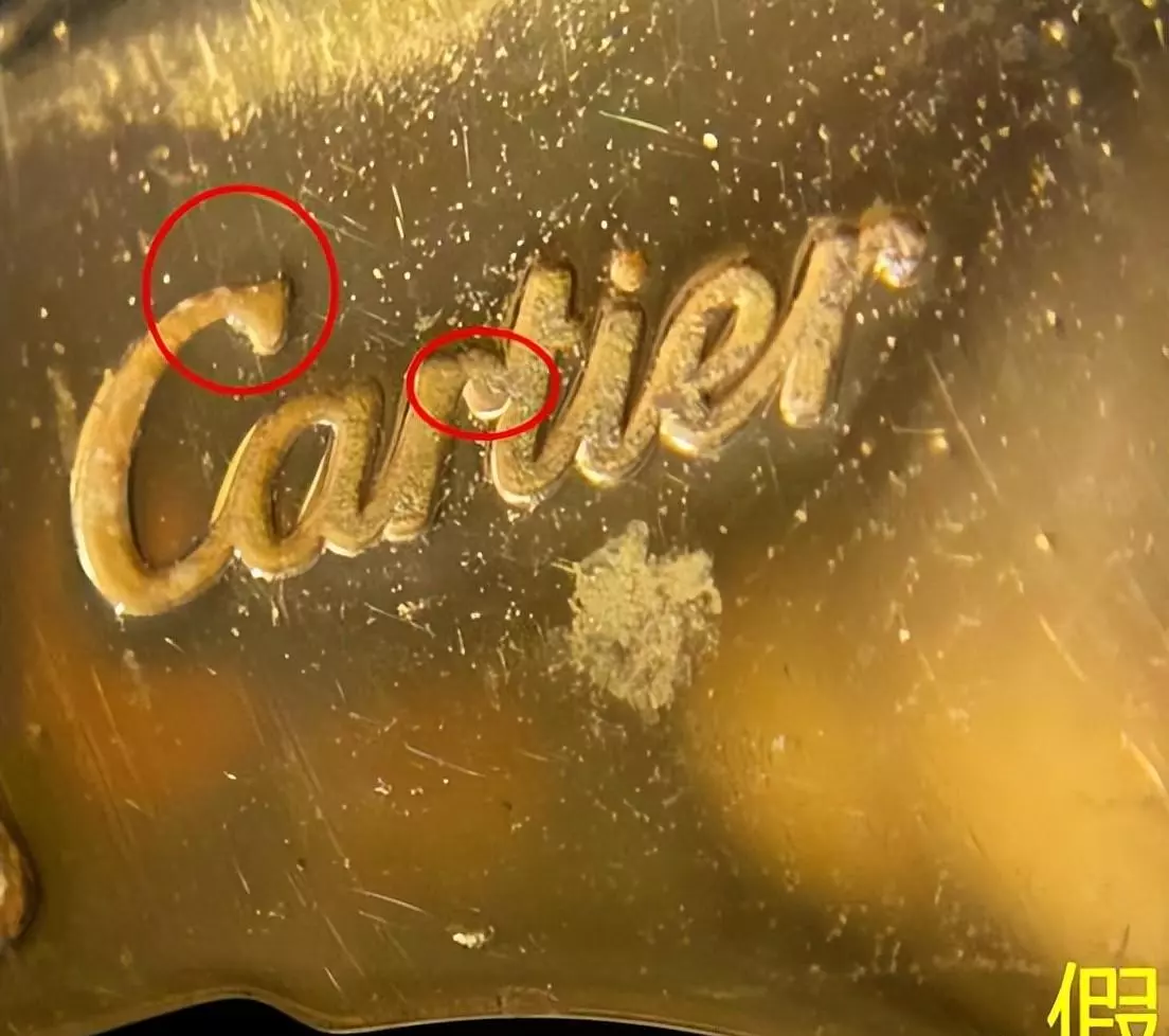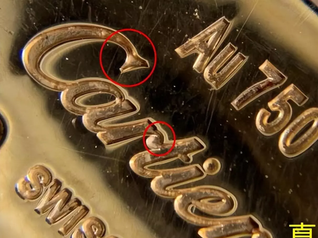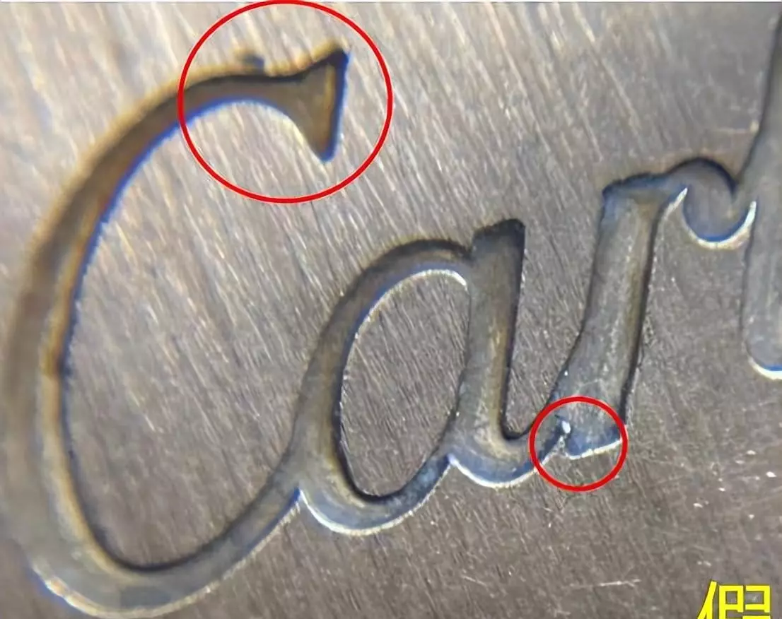 1、后盖刻印-cartier:真表底槽干净,线条硬朗清晰(图中黑色是人体油污,可尝试用牙刷洗净);假表底槽有金属堆积物,笔画赘笔。