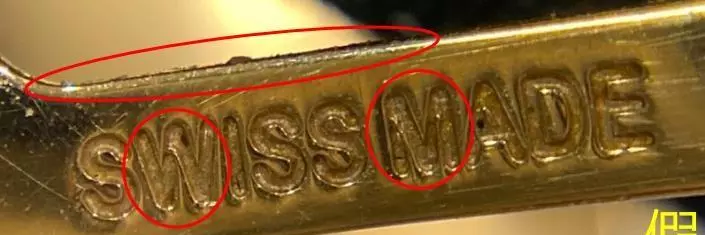 5、表扣刻印:真表底槽干净,线条硬朗清晰,“SWISS MADE”不会连笔;假表底槽有金属堆积物。