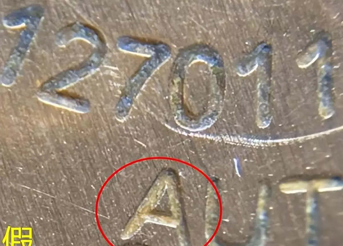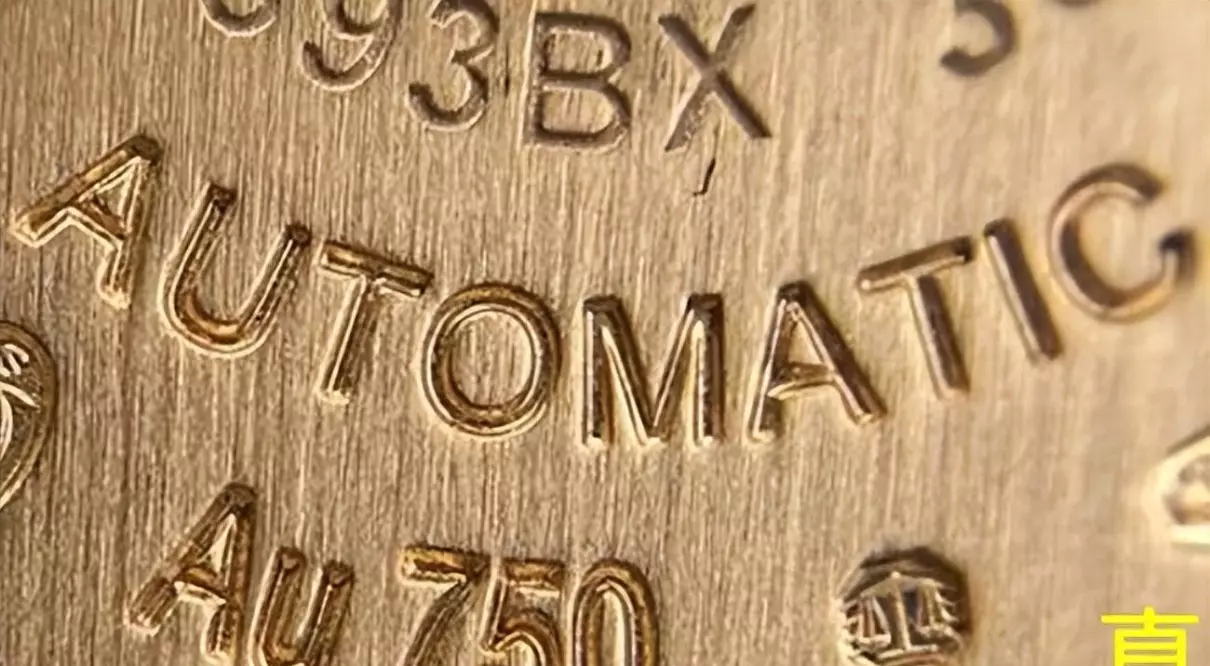 3、后盖刻印-字母:真表底槽干净,线条硬朗清晰;假表底槽有金属堆积物。