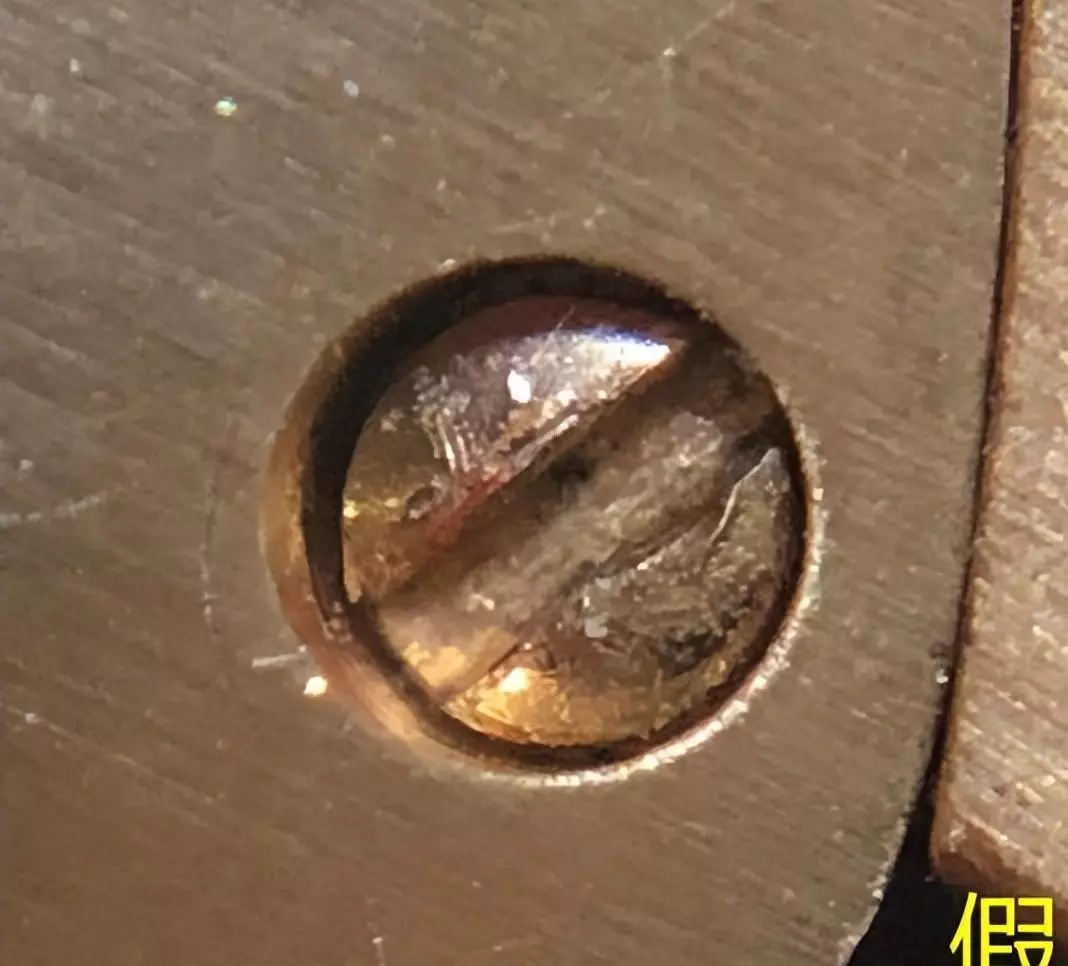 4、后盖螺丝:真表抛光修饰,底槽干净,一字口细长;假表底槽有金属堆积物,一字口宽。