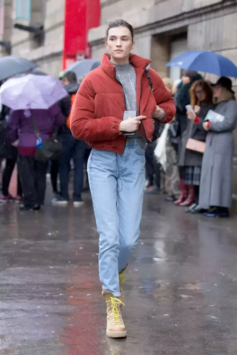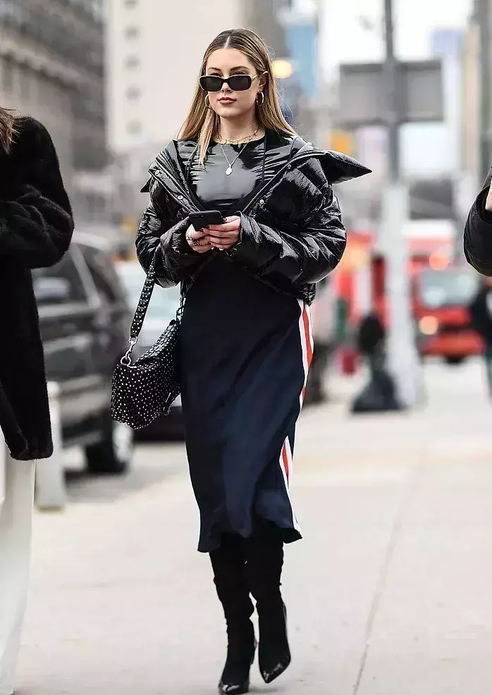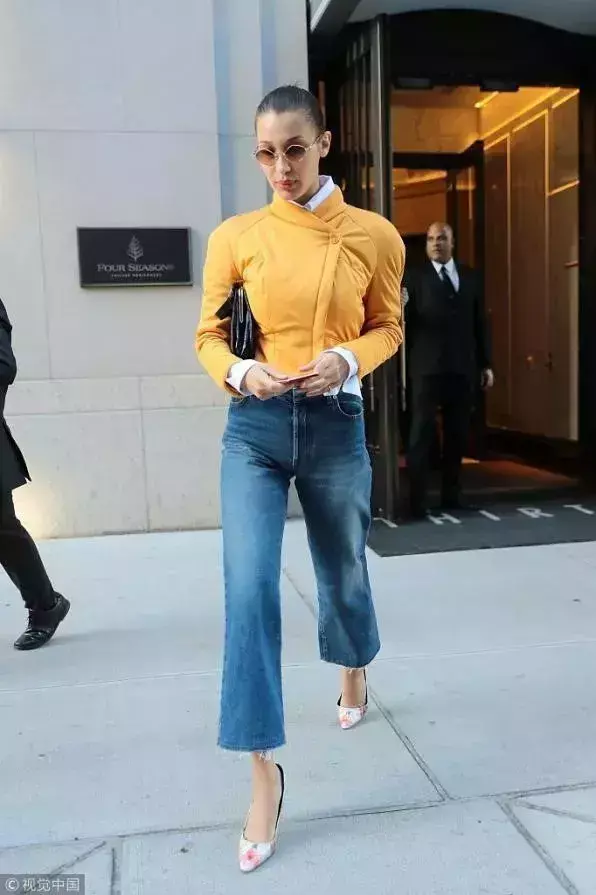 不过更多的是像Bella Hadid这样短巧的夹克样式,也给了更多矮个子女生们显高显瘦保暖又时髦的机会。
