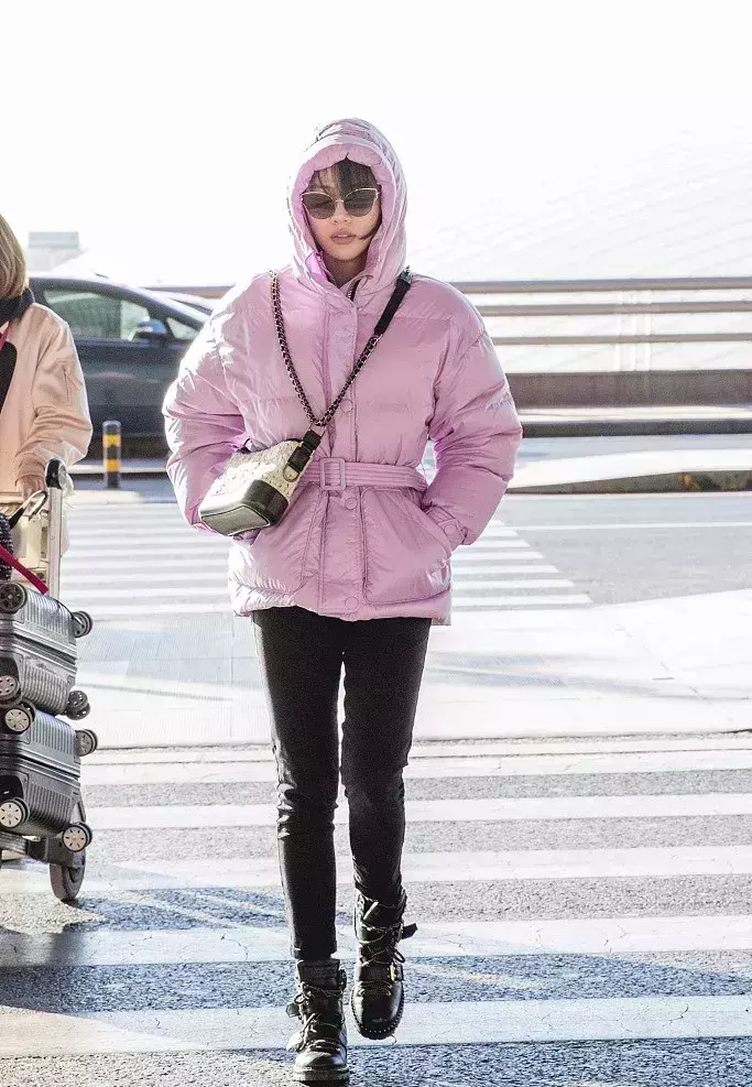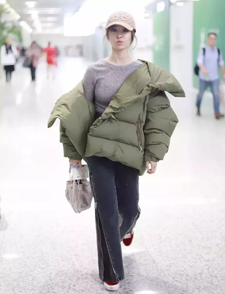 穿羽绒服,即使没有收腰处理,也要制造出腰线的分割,不然很容易像Jolin这样被“埋”在了硕大的羽绒服中......