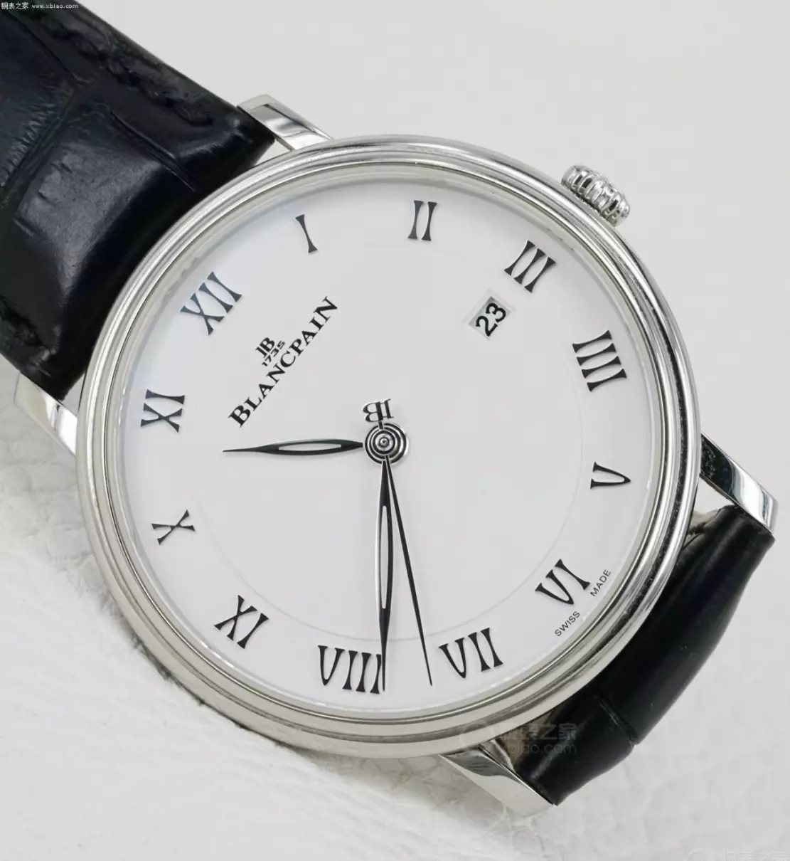 脱胎于上世纪80年的宝珀,如今的VILLERET经典系列也根据现代审美,对盘面进行了调整。6651使用中央镂空的柳叶针,指针全部抛光。在秒针的末端,有宝珀JB标志。另外,宝珀之所以缩写是JB,是因为宝珀历史上的创建者叫Jehan-JacquesBlancpain。手表使用的立体罗马字时标,也是全部抛光。在光线下,整个表盘非常亮。位于3点位的日历,没有占用或干扰罗马字时标的布局,宝珀很好的拿捏了机芯日历圈和盘面大小的比例,整个盘面比例和谐。