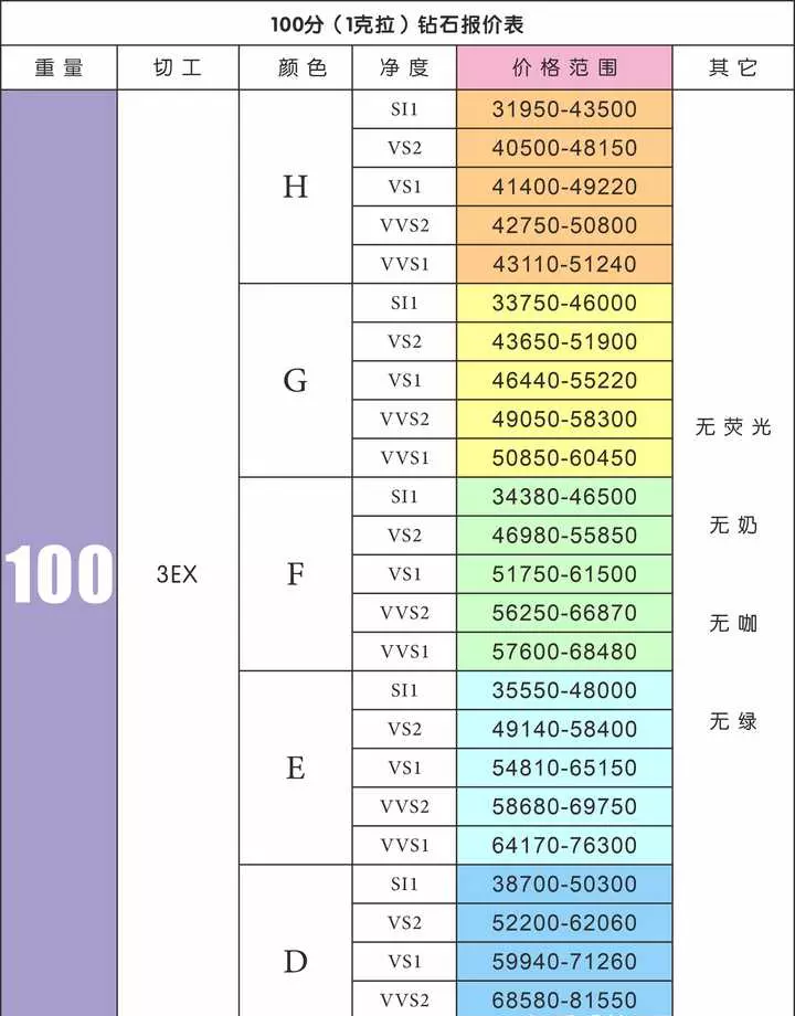 在定制钻戒,六爪戒托我们按照2K来算。钻石方面,给大家看一张1克拉定制裸钻价格表: