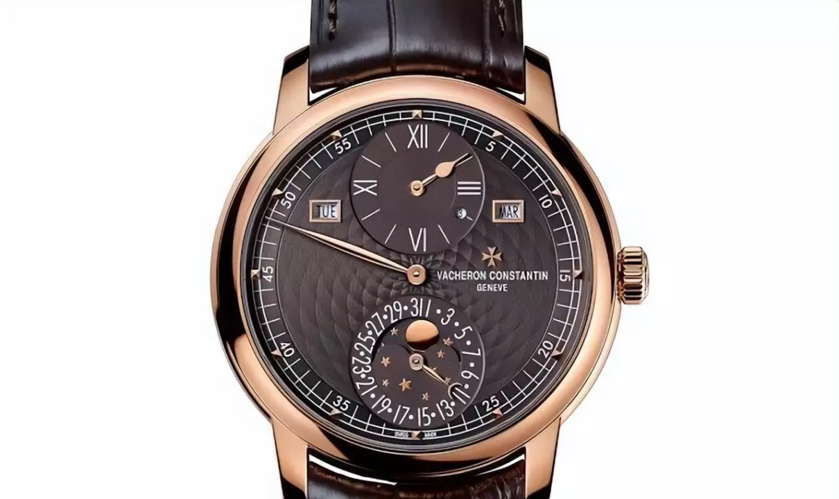 虽然布局简单,但表盘是装饰性的。光滑的棕色表盘饰有旋转的复杂扭索饰纹。指针是铲形的,而时标是小金字塔。为了配合表壳的颜色,时标、指针、月份和日期的窗框以及月亮和星星均采用玫瑰金。