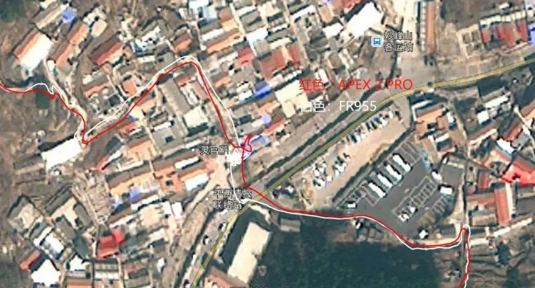 三峰线路的涧沟村,在这里小商店进行吃了碗方便面,总体差不多,都接近实际线路,原地的处理,FR955是一团(感觉没走那么多,进小卖部、出小卖部,再进、再出),APEX 2 PRO进行简化处理。不过这个细节处理,对结果影响不大。