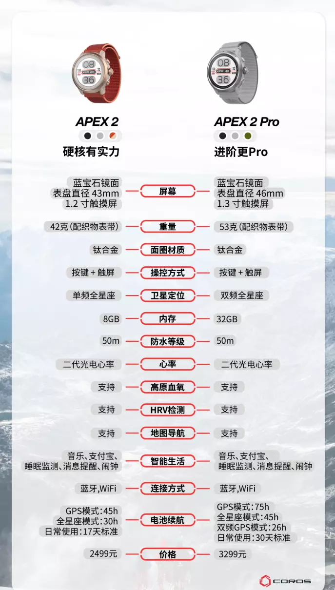 AEPX 2经过了4年,终于升级了,功能基本与APEX 2 PRO相差无几。主要差别在GNSS是单频全星座,尺寸42mm,续航短点,内存小点,重量更轻,其它功能与APEX 2 PRO一样。