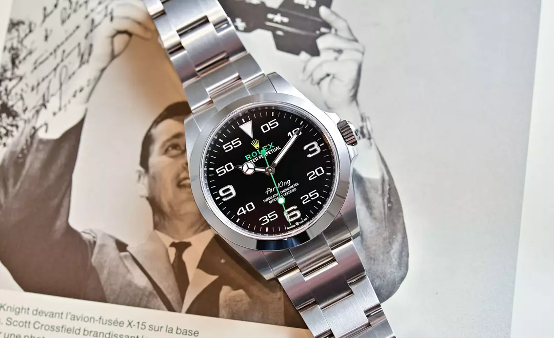 下过海爬过山,劳力士的专业系列中也少不了飞行员腕表,只是AirKing这个系列相对来说没有这么火,原因大概是虽然身为一枚飞行员腕表,但这枚腕表并没有什么特别为飞行员而单独设计的功能。目前该系列的选择也只有一款:直径40毫米的蚝式钢表壳,配备黑色表盘,个人感觉绿色的秒针还是很好看的。总体来说,5-6万的官方价格,如果只是考虑颜值日常自戴的话,入手性价比还是可以的。