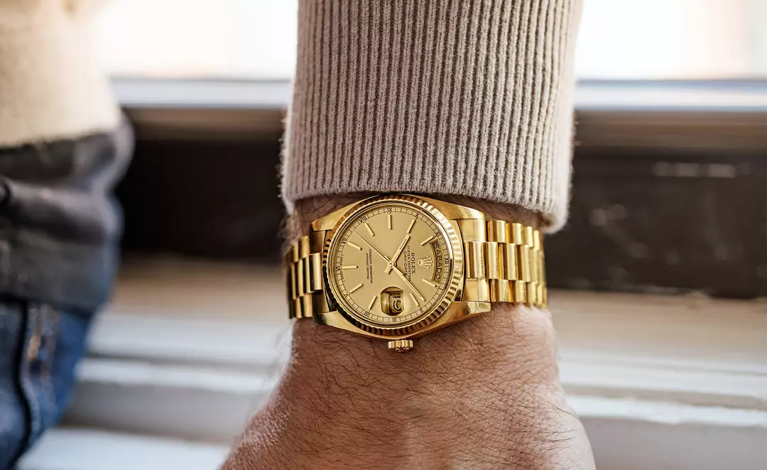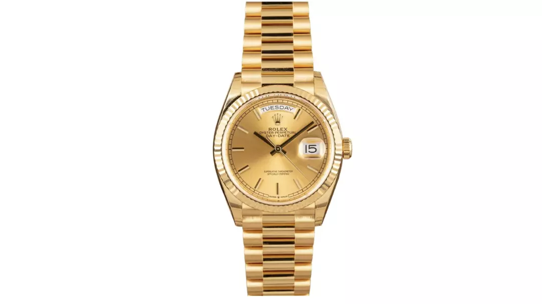 从一开始,Day-Date就只用最好的贵金属锻造,没有钢表款,标志三角坑纹外圈均以18K黄金、白色黄金或永恒玫瑰金铸造。外圈可选择镶钻或密镶钻石款式。像Datejust一样,这里可能的表盘、金属、手链和边框组合非常多,但所有的组合都非常贵气,是美国黑人说唱歌手的最爱。