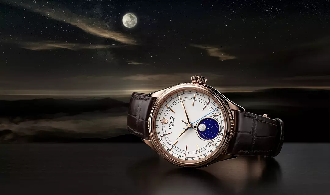 切利尼,可以说是劳力士中最复古和精美的一枚腕表,是整个劳力士阵容中唯一没有蚝式外壳的腕表,长得一点也不像劳。切利尼系列拥有月相型号,表盘六点钟的月相盘,可以显示满月和新月。如眼前这款腕表,满月以圆形陨石象征,新月则以银环代表。腕表配备由劳力士研制的自动上链机械机芯,月相显示122年不用调校。长相美丽,价格也很感人,官方定价20万左右。