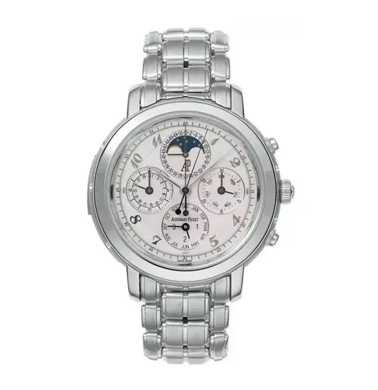 比如这枚爱彼JULES AUDEMARS系列25984PT.OO.1138PT.01腕表,这枚腕表搭载自动机械机芯,表壳和表链等均为950铂金材质,具有月相、计时、和三问等复杂功能,表径42毫米,参考价格10775200元(以实际价格为准)。