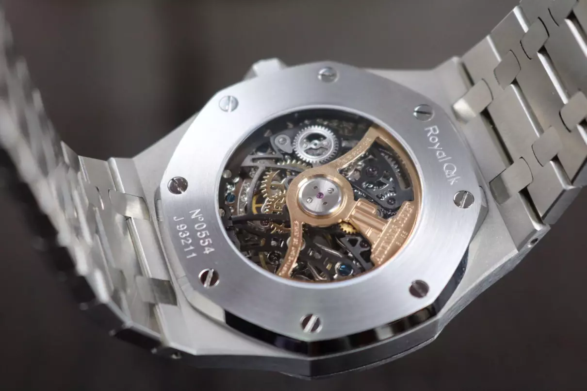 JF厂爱彼皇家橡树AP15407ST镂空复刻版底盖也是采用八颗经过抛光处理的精美螺丝来固定。