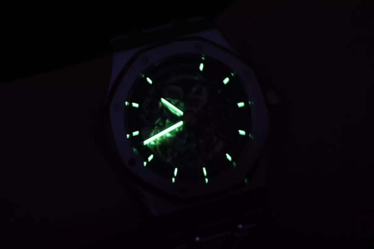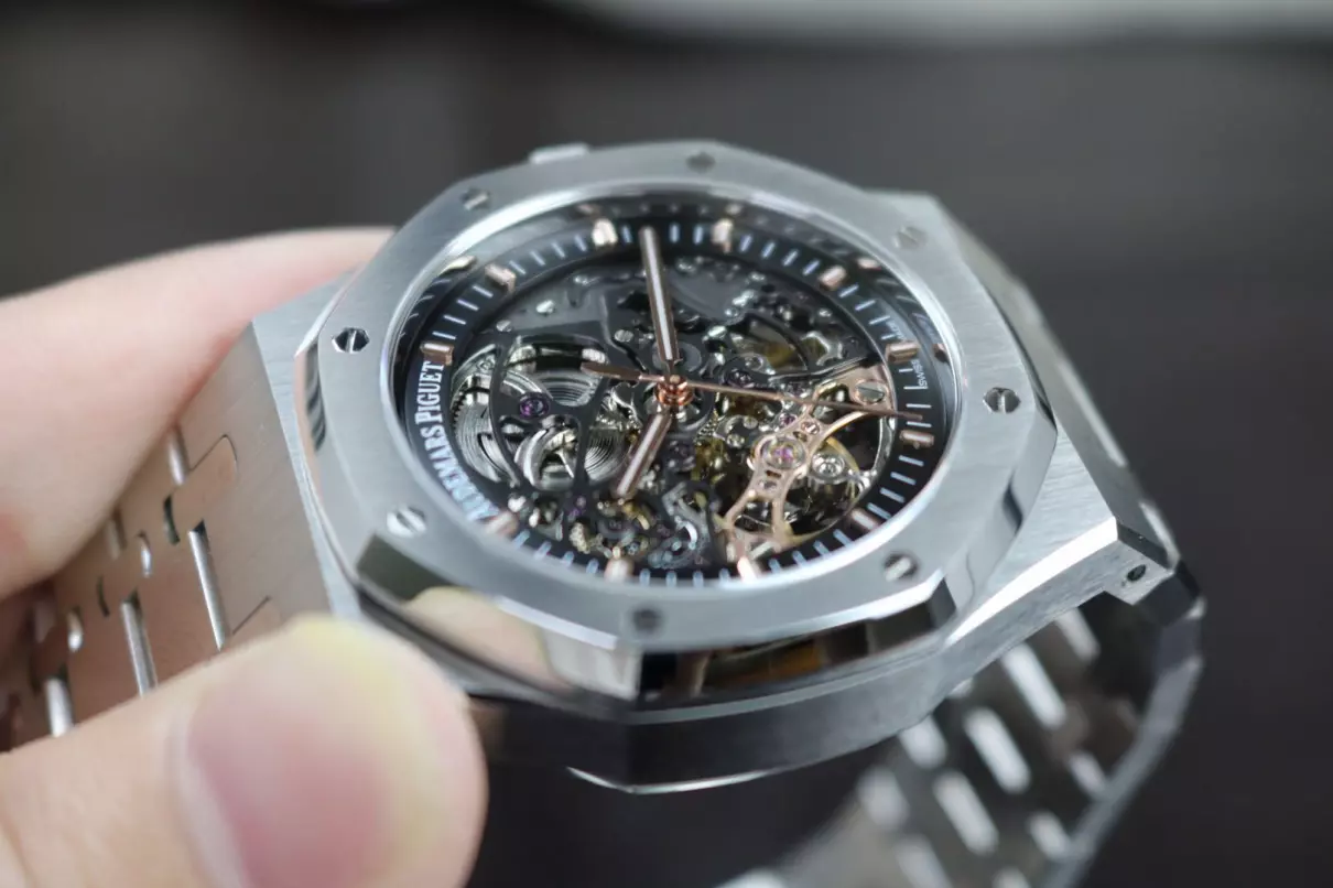 JF厂爱彼皇家橡树AP15407ST镂空复刻版顶盖螺丝保持跟手表表面一个水平线。玻璃边缘稍微外凸,这个也跟原版符合。