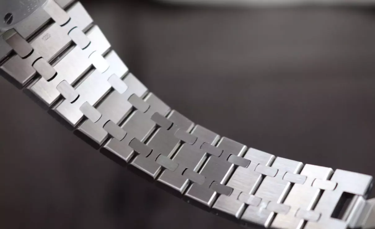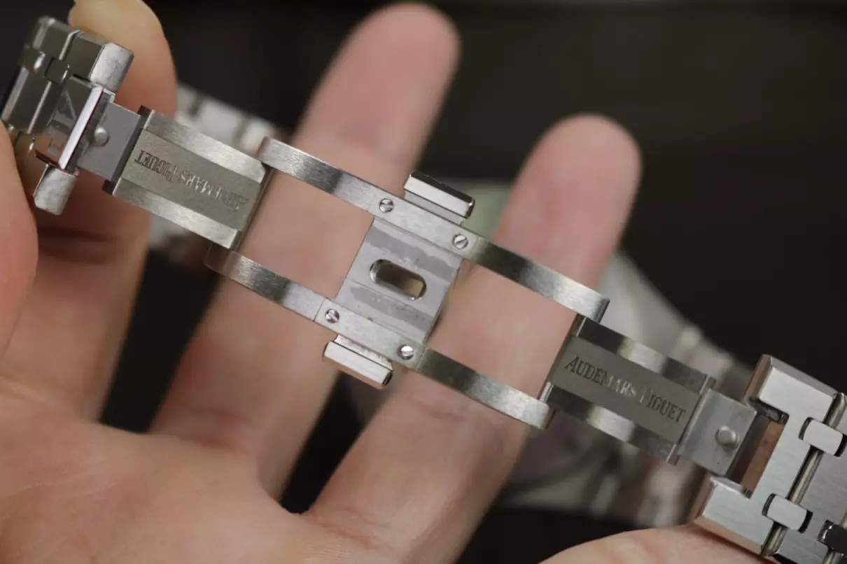 JF厂爱彼皇家橡树AP15407ST镂空复刻版和正品一样采用的是蝴蝶式表扣,表扣采用拉丝的处理,两边刻字处采用铸沙处理,此款表扣以及表带可以和正品互换哦!厚度只有10mm,采用的是316L精钢材质表壳,看上图可见表壳侧面拉丝处理看上去非常有金属的质感,表耳的倒角处理也做的很细腻。