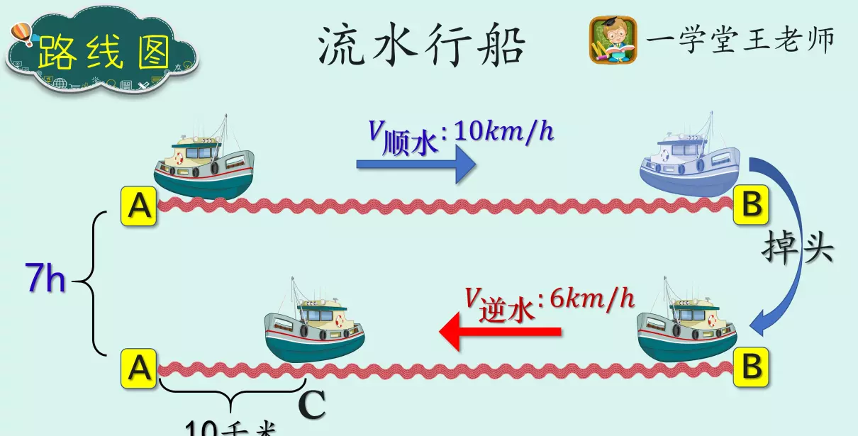 例题:某船从A地顺流而下到B地,然后逆流返回,到达A,B之间的C地。一共航行了7小时,船静水速度为8 km/h,水流速度2 km/h,AC距离为10km。求A,B两地之间的路程?